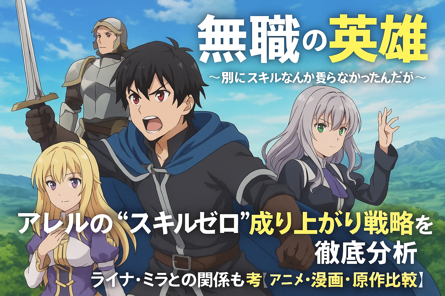 無職──それは、この世界では最も軽んじられる烙印だった。しかし、アレルはそれを逆手に取った。「スキルなんて要らない」と言い切り、自らの鍛錬と信念だけで上級職を凌駕していく。 本記事では、『無職の英雄 ~別にスキルなんか要らなかったんだが~』におけるアレルの成り上がり戦略を軸に、原作・漫画・アニメを横断して作品を読み解きます。ライナ・ミラとの相互作用、能力制度への逆説、物語構造、そして“スキル不要”という逆張り設定が読者を引き込む理由──。これらを丁寧に分析していきましょう。