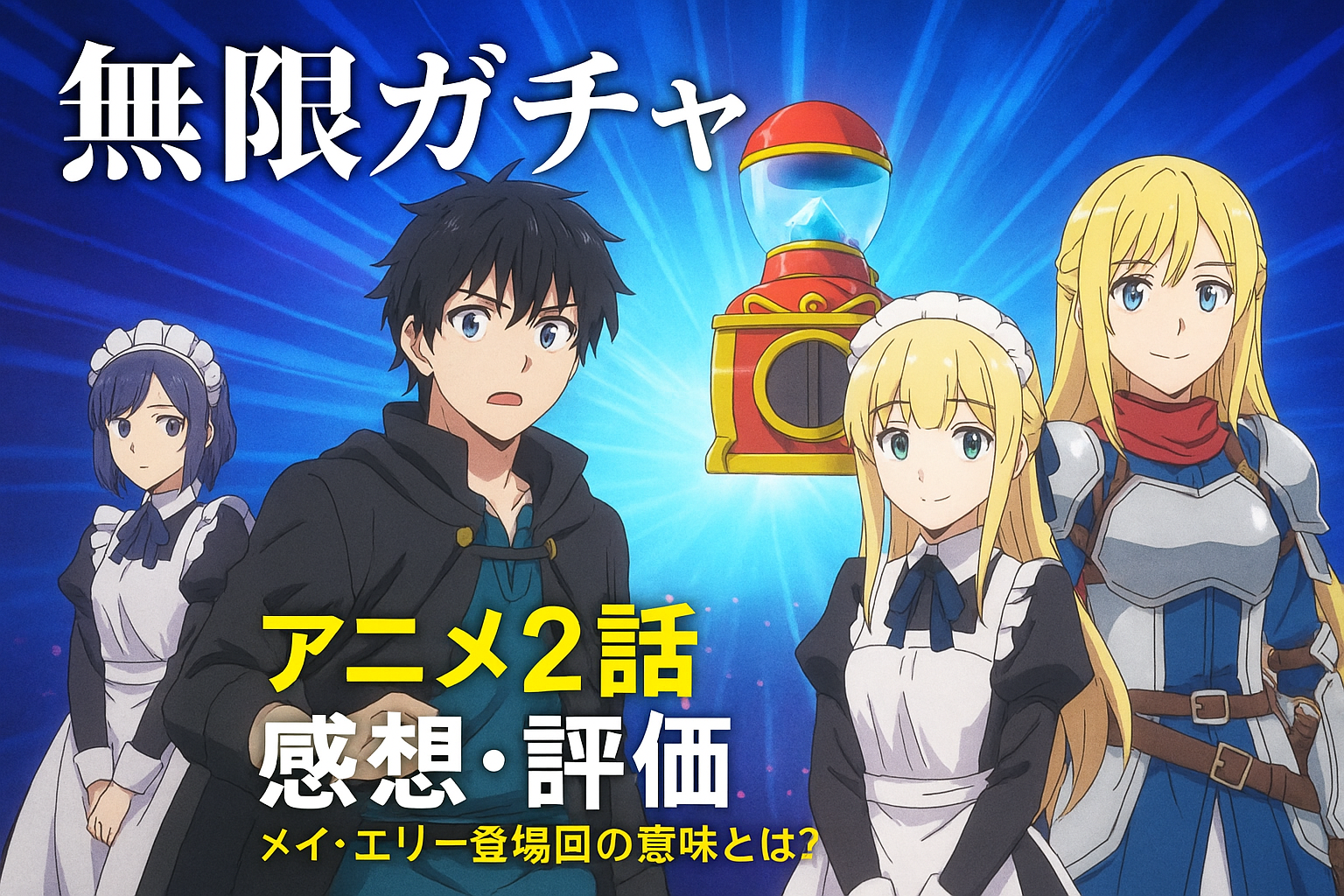 今回は、『無限ガチャ』アニメ第2話の感想・評価を軸に、メイやエリーの登場が作品世界に何をもたらしたのか、さらにEXスキルやキャラの強さランキングまで掘り下げていきます。